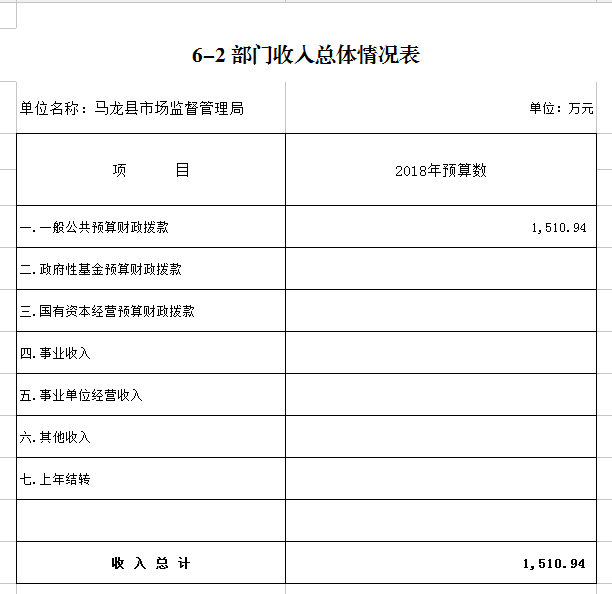 2018年部门财务总收入 1510.94万元,其中:一般公共预算财政拨款1510.94万元。政府性基金预算财政拨款0万元,国有资本经营预算财政拨款0万元,事业收入0万元,事业单位经营收入0万元,其他收入0万元,上年结转0万元。