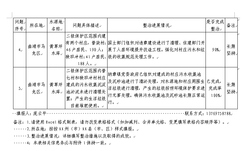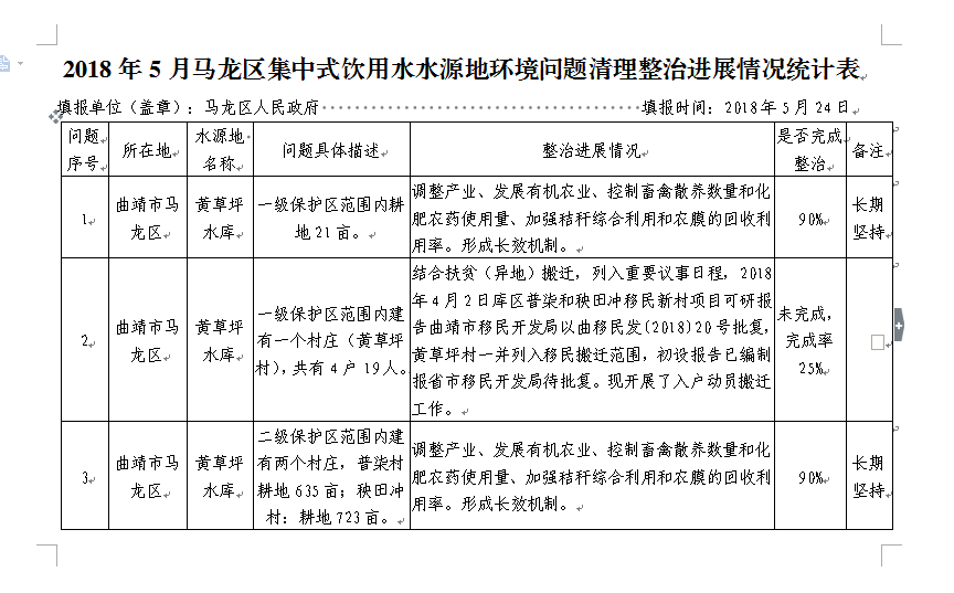 2018年5月马龙区集中式饮用水水源地环境问题清理整治进展情况统计表