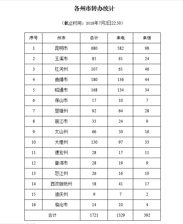 截止目前共计接收到中央第六环保督察组二十八批次共计1721件交办件,其中来电举报1329件,来信举报392件,涉及16个州(市),昆明680件居第一位;曲靖180件居第二位;昭通168件居第三位;大理130件居第四位;红河107件居第五位,重点关注案件507件。