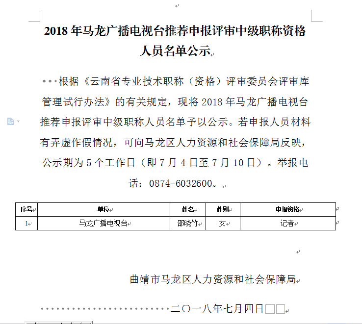 2018年马龙广播电视台推荐申报评审中级职称资格人员名单公示
