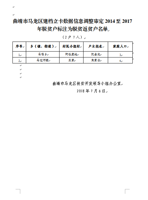 按照曲靖市人民政府扶贫开发办公室关于建档立卡数据信息调整和补录工作的指导意见《曲扶办发〔2018〕14号》要求,曲靖市马龙区建档立卡数据信息调整和补录工作已结束,识别不精准拟剔除182户537人,新识别纳入(包含新识别和整户补录)建档立卡贫困户190户648人,2014至2017年脱贫户认定为脱贫返贫户2户7人。现对审定结果公告如下: